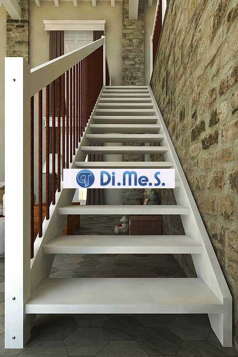 Ringhiera: Composta da capiscala in legno quadrati, corrimano in legno rettangolare e colonne tubolari metalliche.